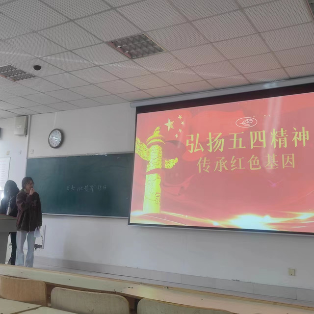 各团支部共青团员代表上台讲述了有关先辈的“五四精神”的故事。随后同学们共同观看电影《建国大业》中与“五四运动”相关的精彩片段,通过影片了解到“五四运动”时期的历史事件。五四风雷,激荡百年;五四精神,薪火相传。救亡图存,挽狂澜于既倒;思想启蒙,发历史之先声。习近平总书记指出:“广大青年对五四运动的最好纪念,就是在党的领导下,勇做走在时代前列的奋进者、开拓者、奉献者,以执着的信念、优良的品德、丰富的知识、过硬的本领,同全国各族人民一道,担负起历史重任,让五四精神放射出更加夺目的时代光芒”。