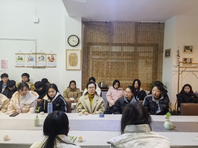 12 月 10 日,外国语学院在乐道书院茶艺室举办了一场以“以文化人 沟通世界”为主题的茶话会。学院党总支书记张立、辅导员老师及 2024 级全体同学一起围坐一堂,面对面,谈成长、说奋斗、话未来,共度了一段暖心的茶语时光。。