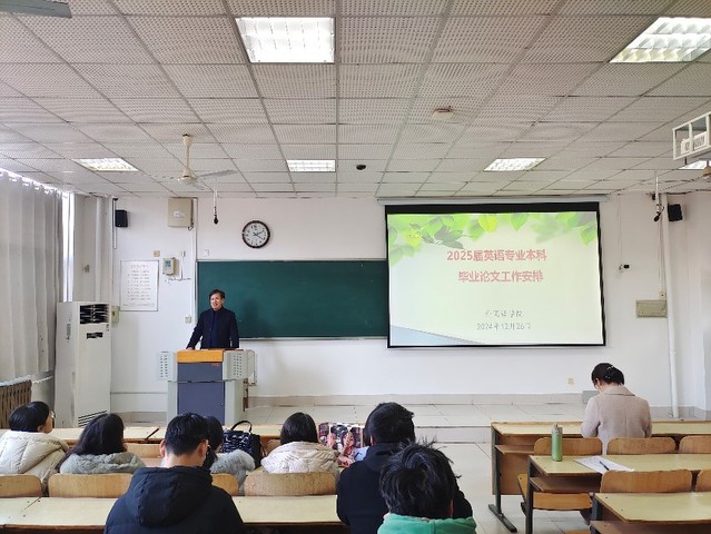 为切实提高毕业论文质量,优化论文管理流程,保障毕业论文工作有条不紊地开展,12 月 26 日下午,外国语学院组织召开了 2025 届英语专业本科生毕业论文工作部署会。外国语学院院长付有龙、全体毕业论文指导教师以及 2021 级英语专业学生参会。