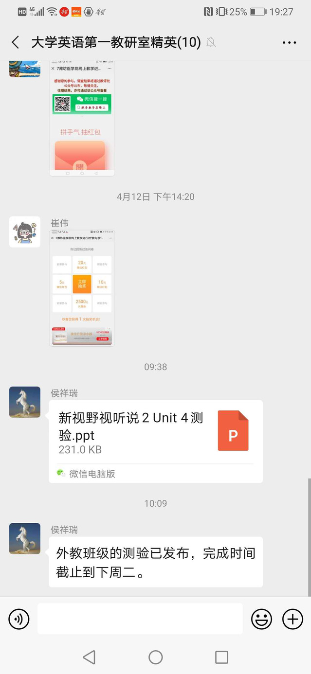 依据学校和外语系对网上直播教学的安排和要求,大学英语第一教研室的老师们不断地探索改进授课方式,完成了从前几周的网上辅导答疑到目前直播授课方式的转变,并采取了形式不一的直播方式,如钉钉直播,腾讯课堂,QQ直播等,取得了良好的教学效果。