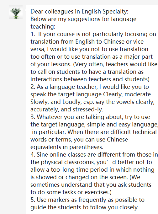 在线教学运行以来,外国语学院建立了由院领导和各教研室主任组成的线上督导群,及时跟踪线上教学效果和质量。通过微信群发布督导任务,召开视频会议,反馈督导意见。督导组通过进入邀请码、加入学院课程群等多种新式“手段”,对使用雨课堂、钉钉、微信、QQ等通讯工具的在线课程进行全面督查,一方面及时发现线上教学的优秀案例,组织经验交流与推广,另一方面及时发现线上教学中存在的问题,及时反馈,积极调整,提供有效解决方案,力求保障线上教学质量不打折。