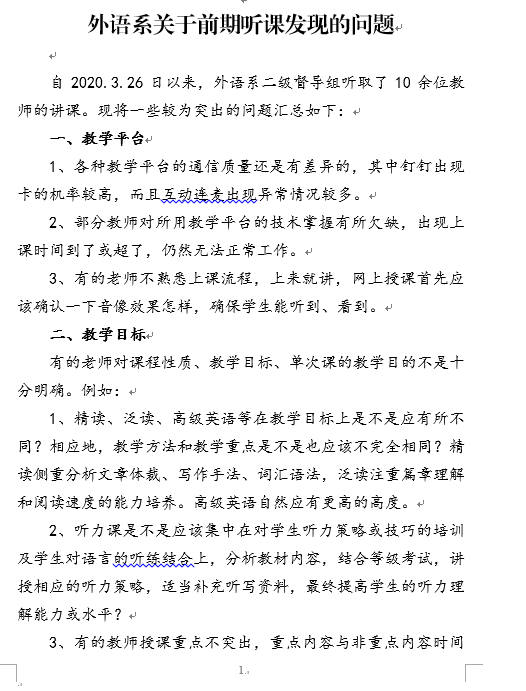 为扎实推进疫情期间教学有序开展,保证在线学习与线下课堂教学质量实质等效,根据学校做好线上教学有关工作的通知精神,外国语学院成立了线上教学督导组。通过每周在线听课督导,掌握线上教学动态,及时发现问题并监督整改,提高在线教学质量、教学效果和教师教学水平。